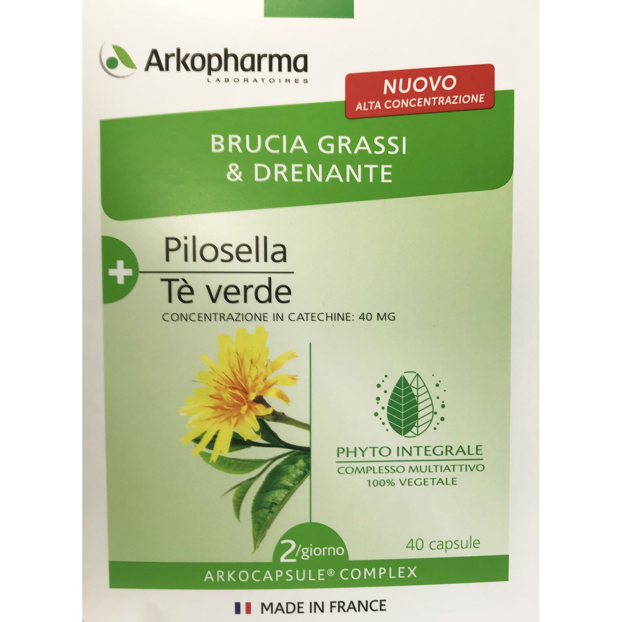 ARKOCAPSULE COMPLEX BRUCIAGRASSI E DRENANTE PILOSELLA + TE' VERDE Formato Confezione da 40 capsule. Integratore alimentare con Pilosella e Te' Verde. La pilosella favorisce l'eliminazione dei liquidi mentre il Te' verde agisce come bruciagrassi. Modo d'uso Assumere 2 capsule al mattino a colazione con un abbondante bicchiere d'acqua. [EAN: 3578835610215]