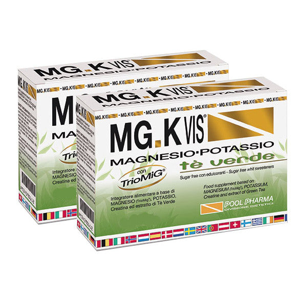 MG.K Vis Bustine è un integratore a base di Magnesio (TrioMig®: Magnesio citrato, Magnesio gluconato, Magnesio lattato) e Potassio con Creatina, utile in tutti i casi di ridotto apporto nutrizionale o di aumentato fabbisogno di tali elementi. Il Magnesio contribuisce alla riduzione della stanchezza e dell’affaticamento, all'equilibrio elettrolitico, al normale metabolismo energetico. In sinergia con il Potassio, contribuisce alla normale funzione muscolare e al funzionamento del sistema nervoso. La fresca e dissetante formulazione con Tè Verde, grazie alle benefiche proprietà di questo estratto, svolge anche un’attività antiossidante-tonica aiutando a contrastare la stanchezza fisica e mentale.