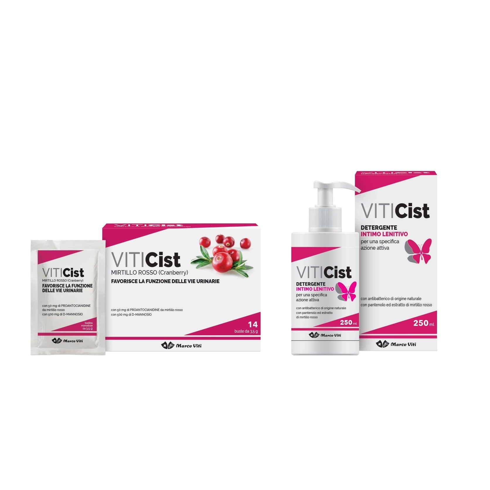Viticist è un integratore alimentare di mirtillo rosso. In sinergia con PACS e D-Mannosio, è utile per favorire la funzione fisiologica delle vie urinarie. Ogni singola bustina VitiCist apporta 50 mg di proantocianidine e 500 mg di D-Mannosio. Contiene altea, con azione emolliente lenitiva per le vie urinarie.