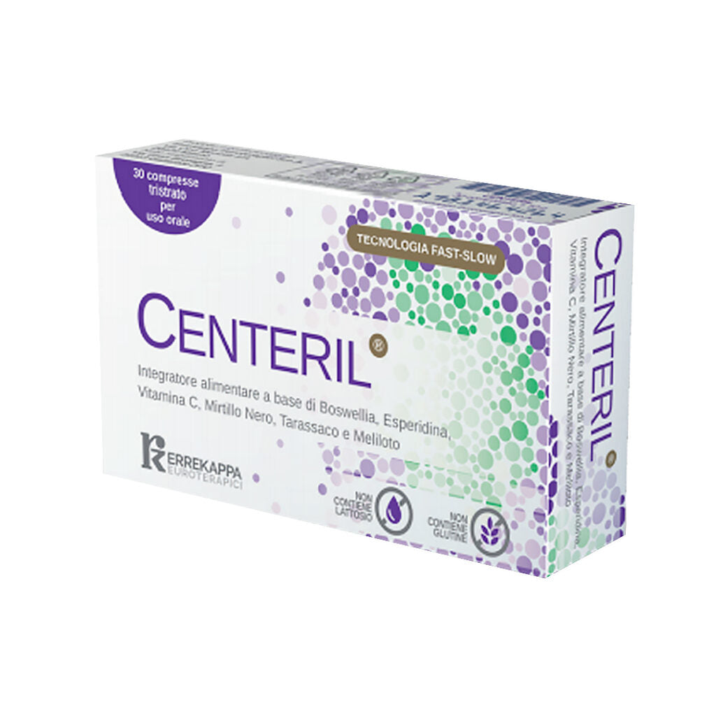 Centeril è un integratore alimentare a base di Boswellia, Esperidina, Vitamina C, Mirtillo Nero, Tarassaco e Meliloto. La Vitamina C contribuisce alla normale formazione del collagene e alla normale funzione dei vasi sanguigni.