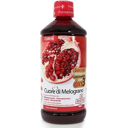 Cuore di Melograno succo con OXY3. La Melograna (Punica Granatum L.) svolge un’azione antiossidante. La Vite Rossa (Vitis vinifera L.) svolge un’azione favorente la funzionalità dell’apparato cardiovascolare.