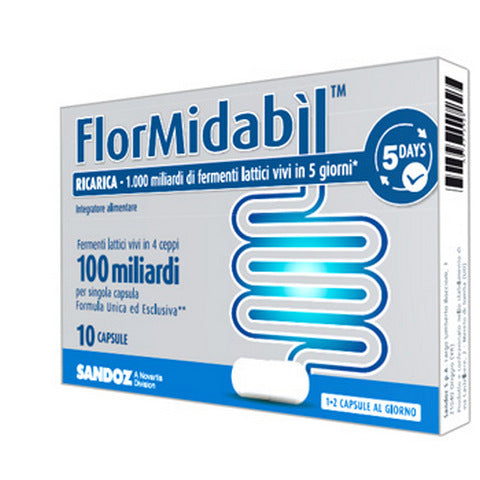 Flormidabìl RICARICA - 1.000 miliardi di fermenti lattici vivi Descrizione Integratore alimentare di fermenti lattici vivi. Flormidabìl Ricarica è a base di probiotici, presenti in una miscela costituita da 4 ceppi differenti, che favoriscono l'equilibrio della flora intestinale. Ingredienti Formula Flormidabìl Sandoz (Bifidobacterium lactis Bl-04, Lactobacillus acidophilus paracasei SDZ-22); agente di rivestimento: idrossipropilmetilcellulosa; agente di carica: cellulosa microcristallina; agenti antiagglomeranti: sali di magnesio degli acidi grassi, biossido di silicio; colorante: biossido di titanio. Senza glutine e senza lattosio. Caratteristiche nutrizionali Valori medi per 1 capsula per 2 capsule Formula Flormidabìil Sandoz, di cui: -bifidobacterium lactis (Bl-04) -lactobacillus acidophilus (La-04) -lactobacillus plantarum (SDZ-11) -lactobacillus paracasei (SDZ-22) 100 mld UFC* 75 mld UFC 20 mld UFC 4,0 mld UFC 1,0 mld UFC 200 mld UFC 150 mld UFC 40 mld UFC 8,0 mld UFC 2,0 mld UFC *UFC: Unità Formanti Colonia. Modalità d'uso Un ciclo di Flormidabìl Ricarica comporta l'assunzione di 2 capsule al giorno (in un'unica soluzione), per un periodo di 5 giorni, da sciogliere direttamente in bocca oppure da deglutire con un bicchiere di acqua. È possibile assumere anche solo 1 capsula al giorno in maniera continuativa. Assumere il prodotto nel momento più comodo della giornata (es. appena prima o subito dopo un pasto) rispettando però un intervallo di almeno tre ore dall'eventuale assunzione dell'antibiotico. Avvertenze Tenere fuori dalla portata dei bambini al di sotto dei 3 anni di età. Tenere fuori dalla portata dei bambini al di sotto dei 3 anni di età. Non superare la dose giornaliera raccomandata. Il prodotto non è indicato per bambini e adolescenti. Il prodotto contiene polioli: un consumo eccessivo può avere effetti lassativi. Confezionato in atmosfera protettiva. Conservazione Conservare a temperatura inferiore a 25°C; evitare l'esposizione a fonti di calore localizzate, ai raggi solari e tenere al riparo dall'umidità. Il termine minimo di conservazione si riferisce al prodotto in confezione integra, correttamente conservato. Validità a confezione integra: 24 mesi. Formato Confezione contenente 10 capsule da 500 mg. Peso netto: 5 g.