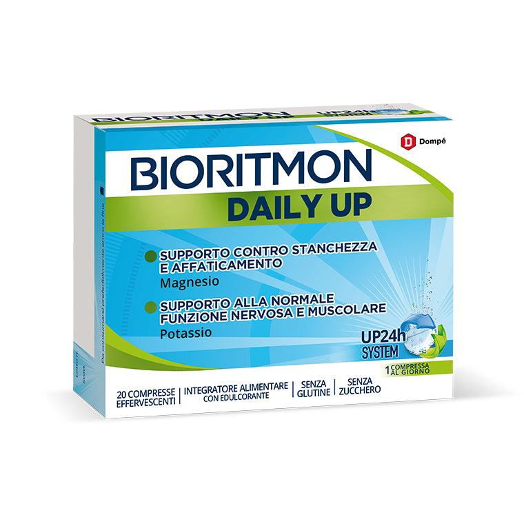 Bioritmon Daily Up è un integratore alimentare a base di Magnesio e Potassio. La sua formula osmoticamente bilanciata e la singola somministrazione giornaliera (UP24h System) ne rende maneggevole l’utilizzo nelle situazioni di spossatezza fisica e stanchezza precoce, dovute a un aumentato fabbisogno o a una carenza di Magnesio e Potassio.