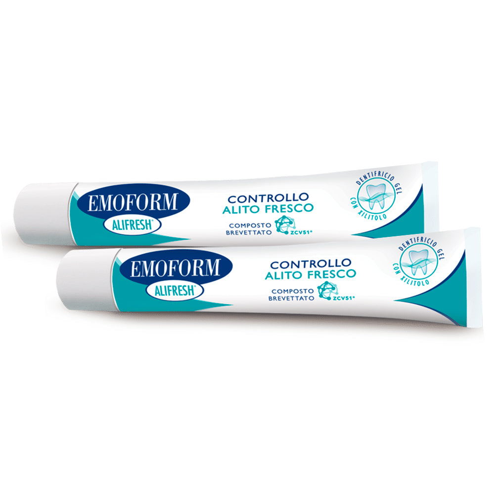 Emoform Alifresh dentifricio rappresenta una vera innovazione nel trattamento dell’alitosi. Il cuore del prodotto consiste nell’esclusivo composto brevettato ZCV51 il quale, grazie allo zinco cloruro, alle carragenine ed agli estratti vegetali tra cui calendula, propoli ed aloe, aiuta a risolvere in modo veloce e duraturo le cause dell’alitosi. Inoltre gli estratti di aloe, calendula, sanguinaria e propoli aiutano a combattere la formazione della placca dentale e a mantenere le gengive sane. ?Infine, la presenza di polimeri naturali, consente un rilascio graduale dei componenti attivi, donando un alito fresco per lungo tempo. Contiene: Fluoruro di sodio (900 ppm), ZCV51 ed Estratti vegetali.