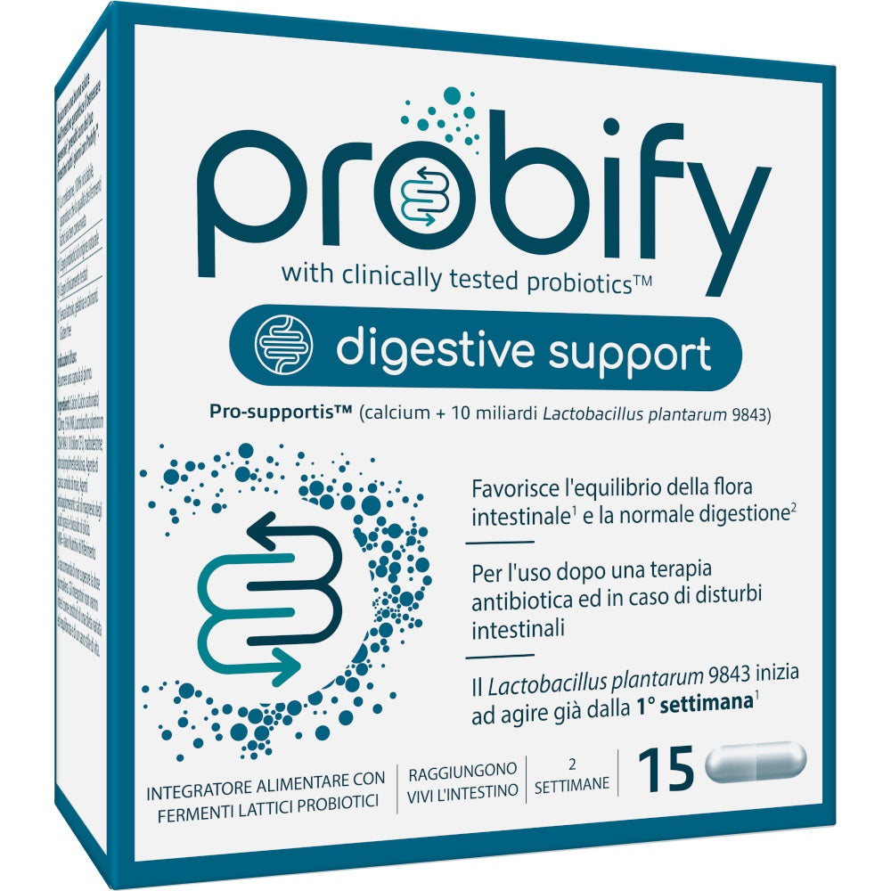 Probify Digestive Support e' un integratore alimentare quotidiano che combina i probiotici clinicamente testati con il calcio, per contribuire al sistema digerente e alla corretta digestione. La sua formula e' altamente resistente agli acidi digestivi dello stomaco, in modo che questi probiotici raggiungano vivi l'intestino e colonizzino il tratto gastrointestinale.