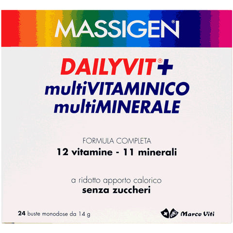 MASSIGEN DAILYVIT+ INTEGRATORE ALIMENTARE Formato Confezione da 24 Buste. Aroma: Passion Fruit Fai il pieno di energia! Massigen Daylivit+ e' un integratore alimentare a base di Vitamine e Sali Minerali, preziosi nei casi di diminuito apporto con la dieta o aumentato fabbisogno fisiologico. Indicato per chi vuole assumere integratori a ridotto apporto calorico. Modalita' d'impiego Si consiglia l'assunzione di 1 bustina al giorno da sciogliere in 200ml di acqua. [EAN: 8050519570466]