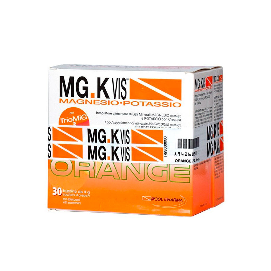 MG.K Vis Bustine è un integratore a base di 3 sali organici assimilabili di Magnesio (TrioMig®: Sali di Magnesio dell’acido citrico, Magnesio gluconato, Magnesio lattato) e Potassio con Creatina. Il Magnesio contribuisce alla riduzione della stanchezza e dell’affaticamento, all’equilibrio elettrolitico, al normale metabolismo energetico. In sinergia con il Potassio, contribuisce alla normale funzione muscolare e al funzionamento del sistema nervoso.