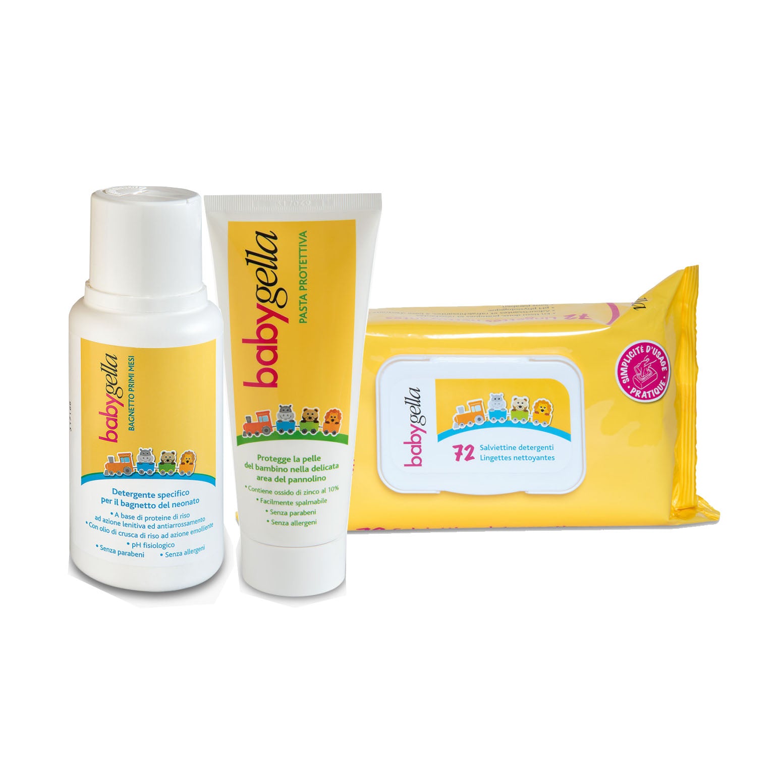 BABYGELLA KIT PICCOLISSIMI 0-6 MESIFormatoLa confezione contiene:- Babygella bagnetto primi mesi 200 ml;- Babygella Pasta protettiva 100 ml;- Babygella Salviettine detergenti 72 pezzi.BABYGELLA BAGNETTO PRIMI MESI