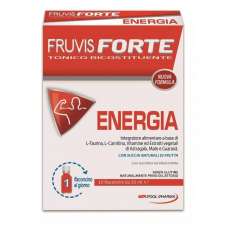 FRUVIS FORTE “Energia”, innovativi flaconcini a base di Vitamine, Estratti Vegetali, Aminoacidi e Succhi di frutta naturali concentrati (Noni, Papaya, Lampone). Pratici da assumere a casa o fuori, senza glutine e lattosio, possono essere un valido aiuto nelle situazioni in cui la stanchezza psico-fisica si fa sentire di più, ai cambi di stagione, in caso di convalescenza, quando serve migliorare l’efficienza muscolare e il tono fisico. La Niacina e l’Acido Pantotenico contribuiscono al normale metabolismo energetico, alla riduzione della stanchezza e dell’affaticamento. Le Vitamina B6 e B12 favoriscono il buon funzionamento del sistema immunitario, del sistema nervoso e la normale funzione psicologica, la Riboflavina contribuisce alla protezione delle cellule dallo stress ossidativo. Gli e.s. di Mate e Guaranà hanno un’azione tonica in caso di stanchezza fisica e mentale, l’Astragalo è un tonico-adattogeno, il succo concentrato di Noni ha proprietà antiossidanti mentre il succo di Papaya favorisce le naturali difese dell’organismo. Completano la formula L-Taurina e L-Carnitina che contribuiscono ad aumentare la resistenza alla fatica.